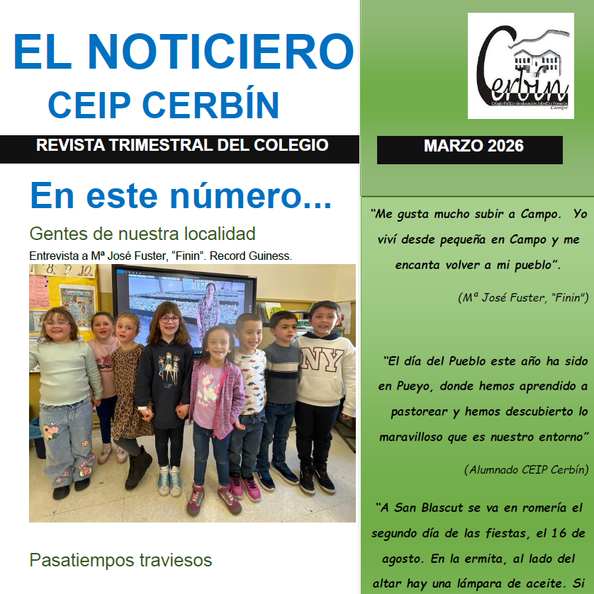 Todos nuestro alumnado ha trabajado para completar las páginas que nos llevarán a conocer un poco más a Mª José Fuster, a saber de chascarrillos e historietas de Campo a través de pasatiempos, veremos las estampas recogidas de libros de nuestro pueblo, recordaremos las excursiones realizadas en este segundo trimestre y por último viviremos de nuevo la prehistoria con los nenes de infantil.